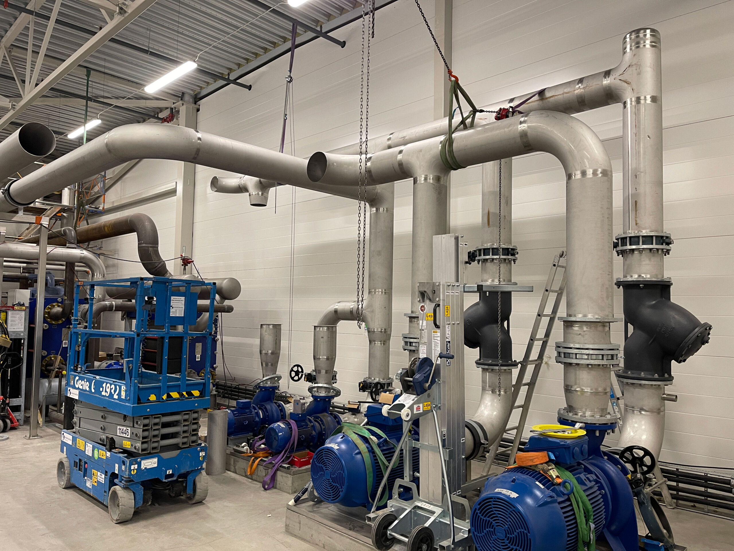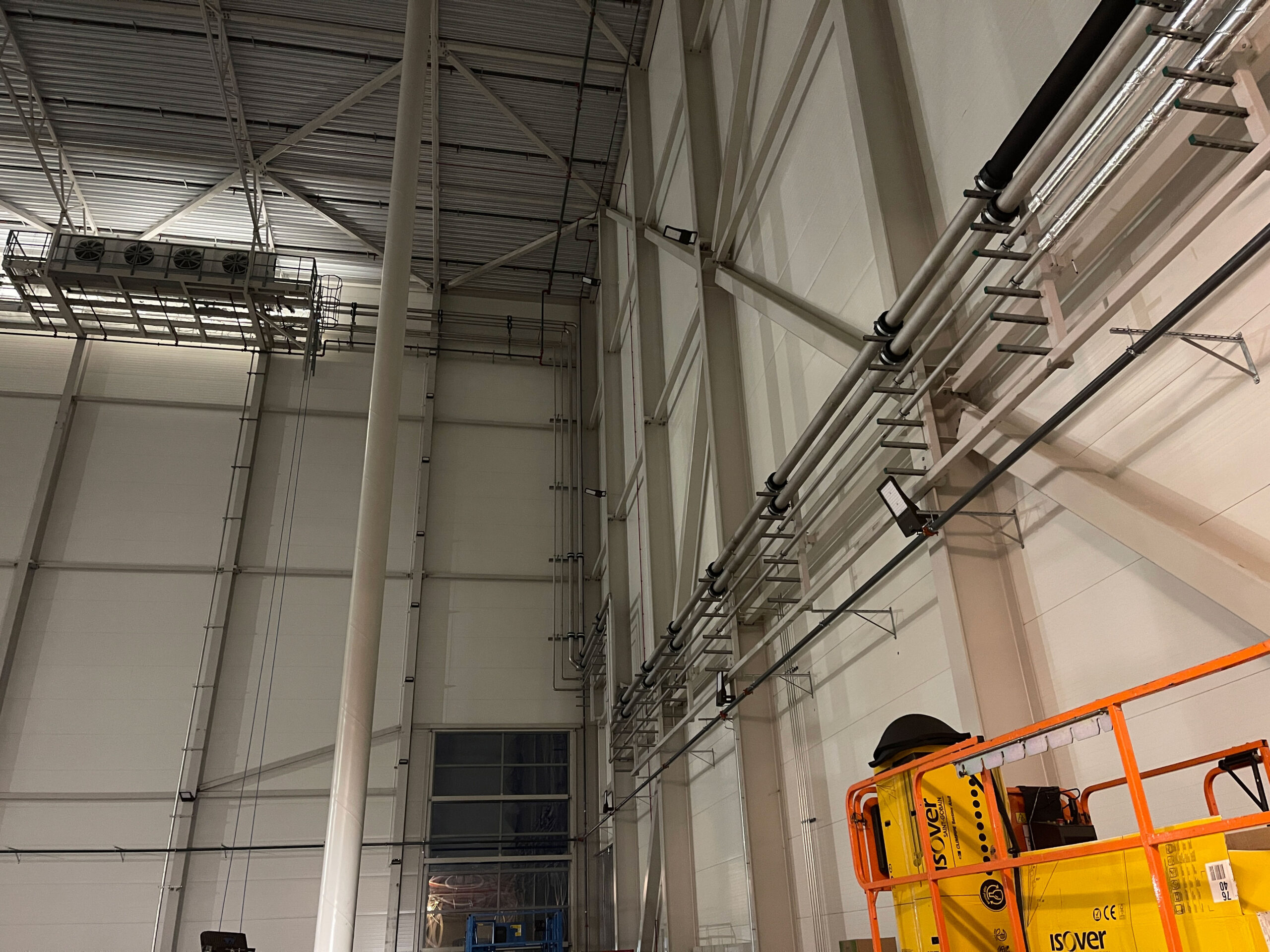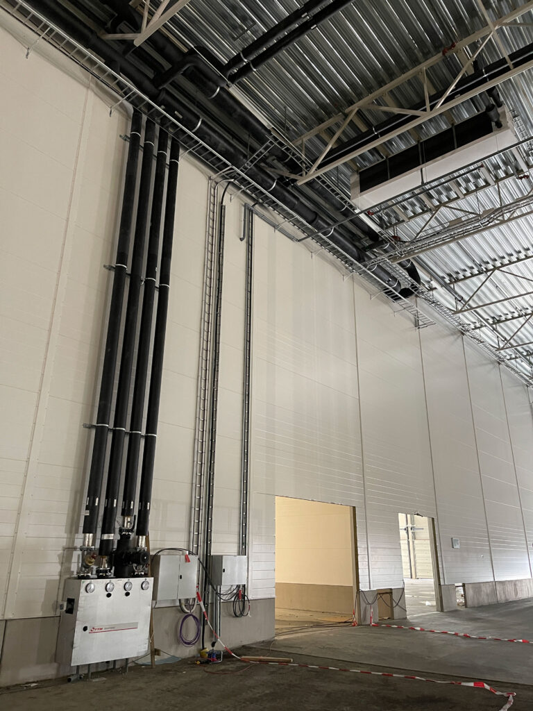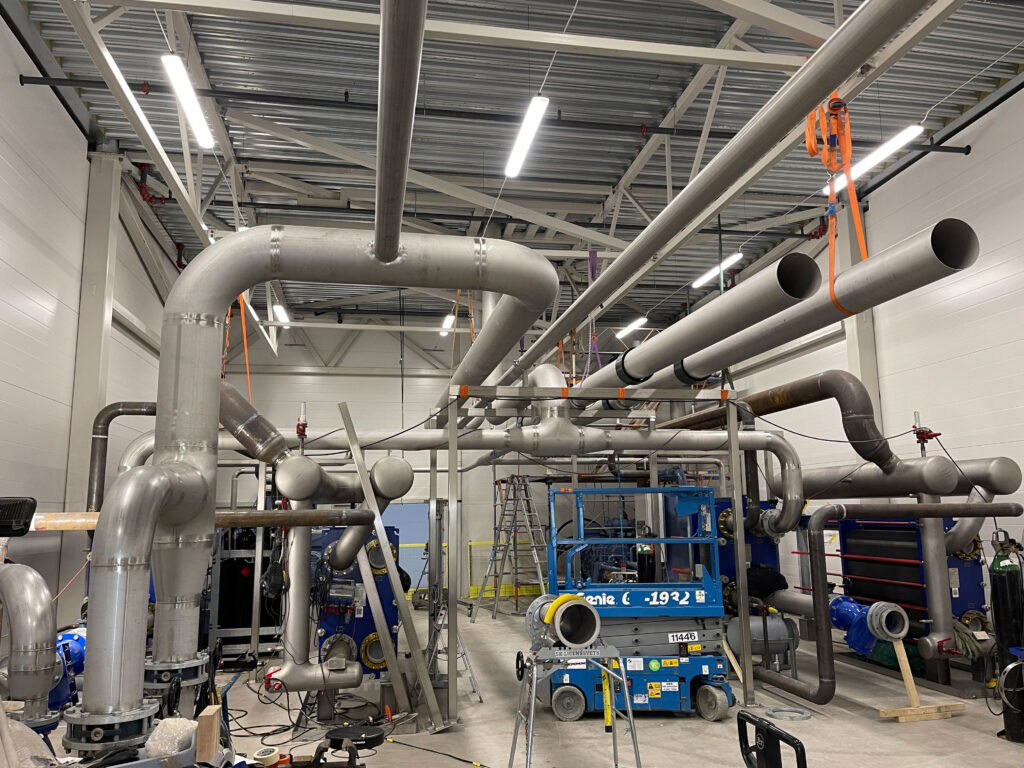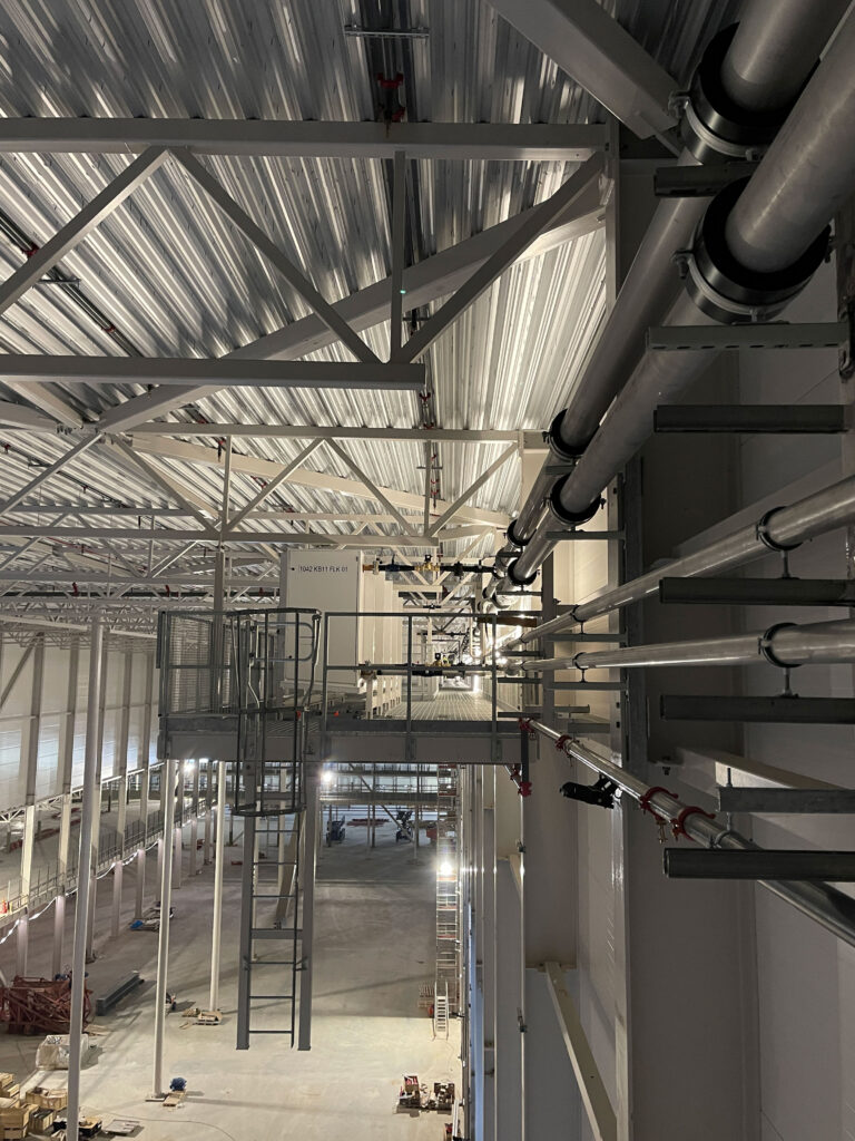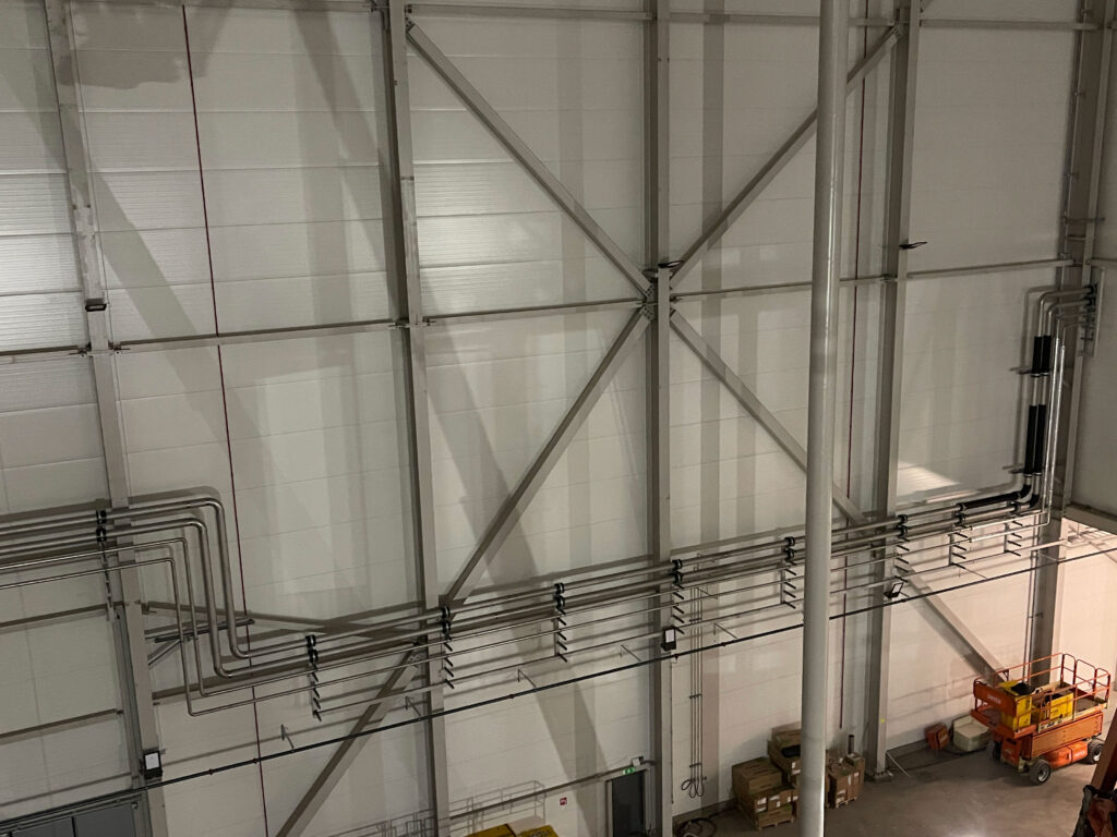 In 2021, we completed a large-scale piping project at Coop Lager in Eskilstuna. This included over 11 km of stainless steel glycol pipes (DN25–300) and black steel (P235GH) ammonia lines connecting compressors, heat exchangers, pumps, and tanks. We installed 51 cooling and 5 freezing units, with the main line routed along the roof and internal connections made beneath the ceiling. All welding met X-ray and visual inspection standards.