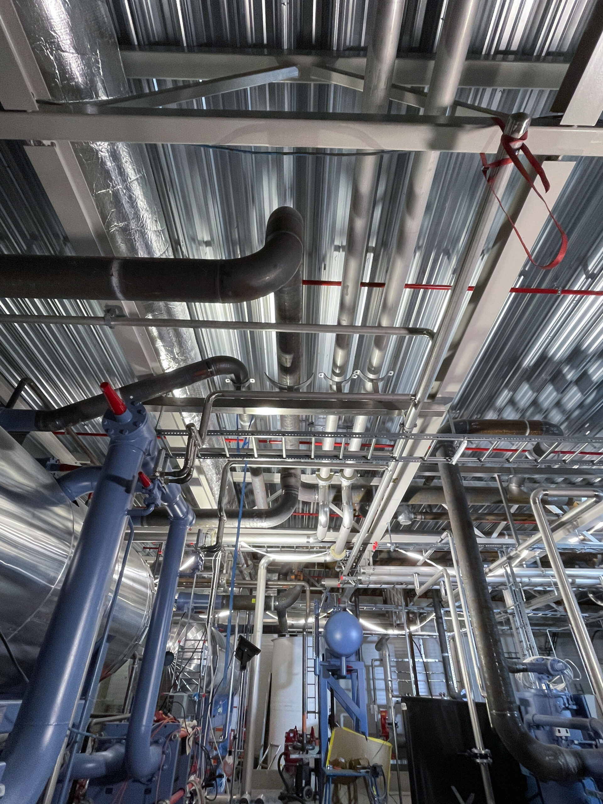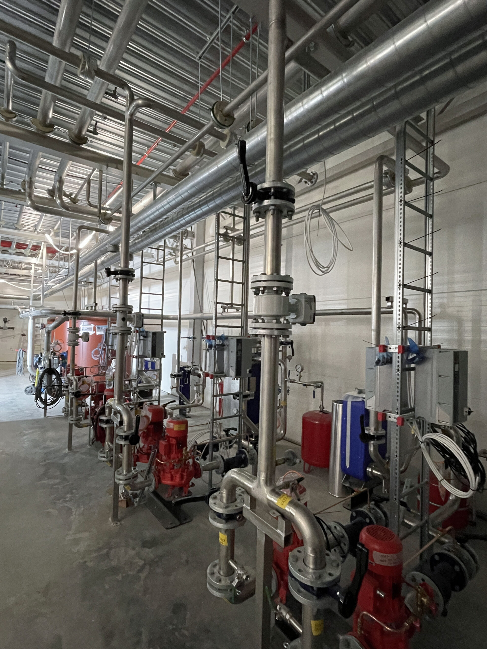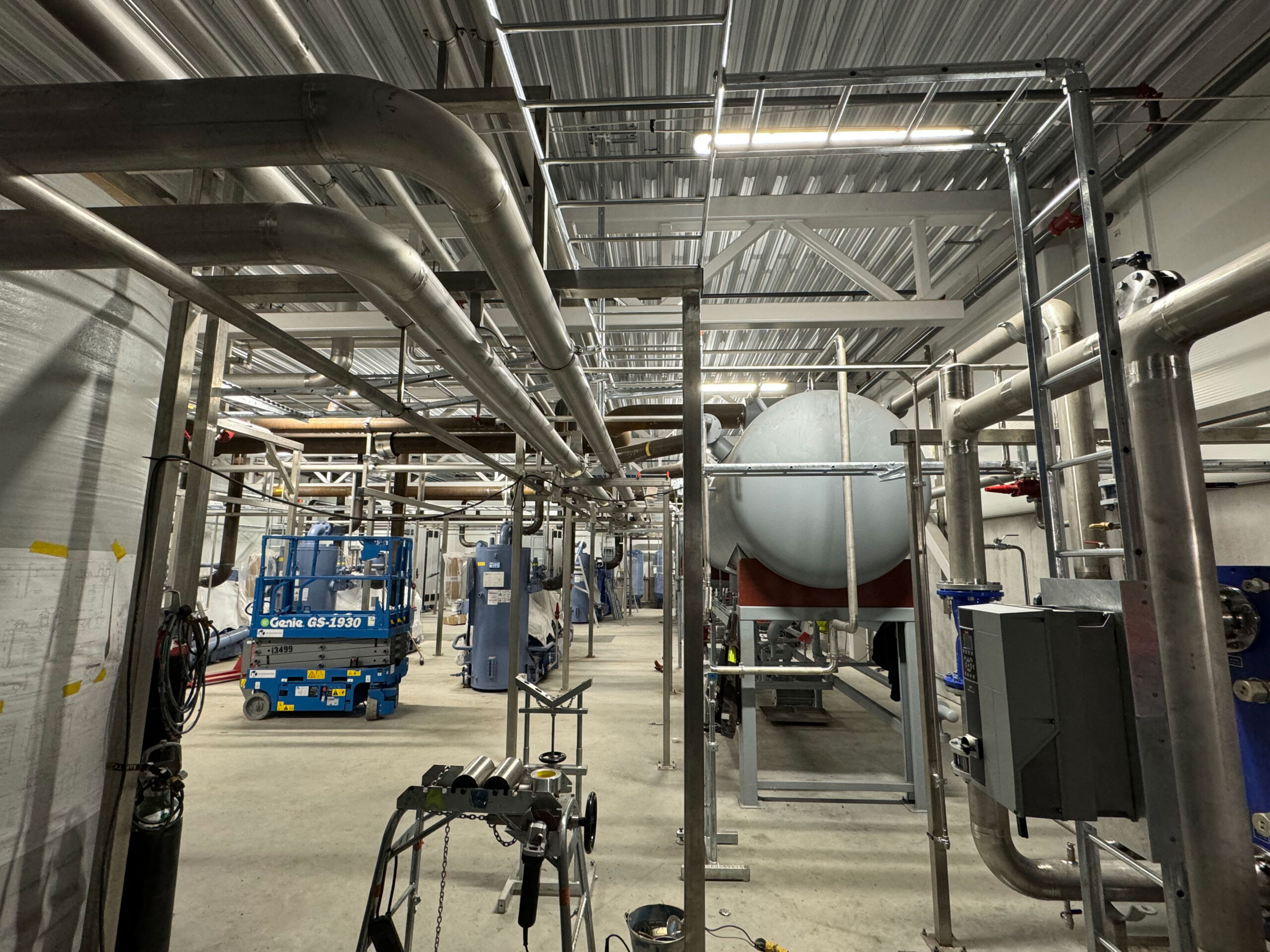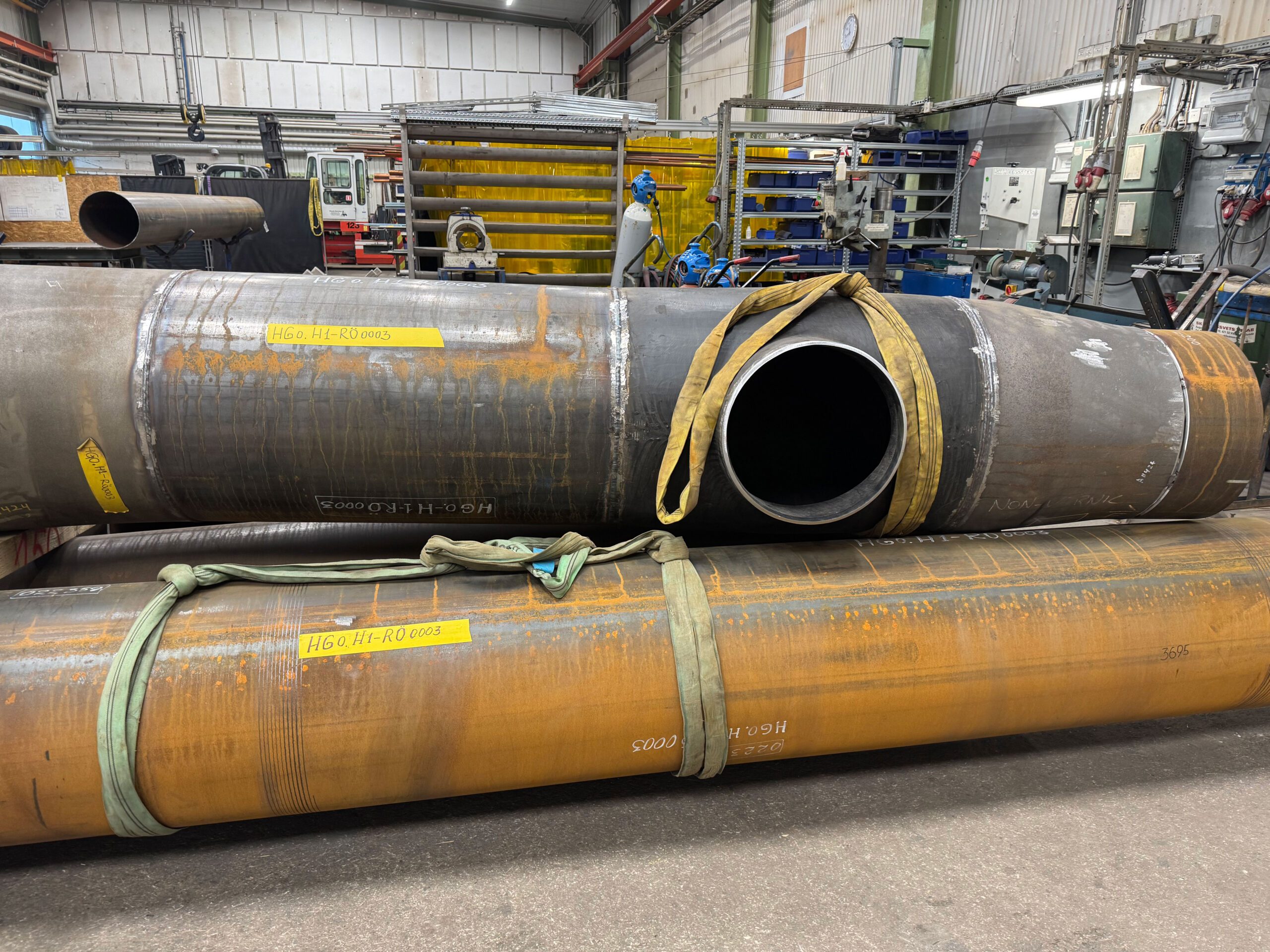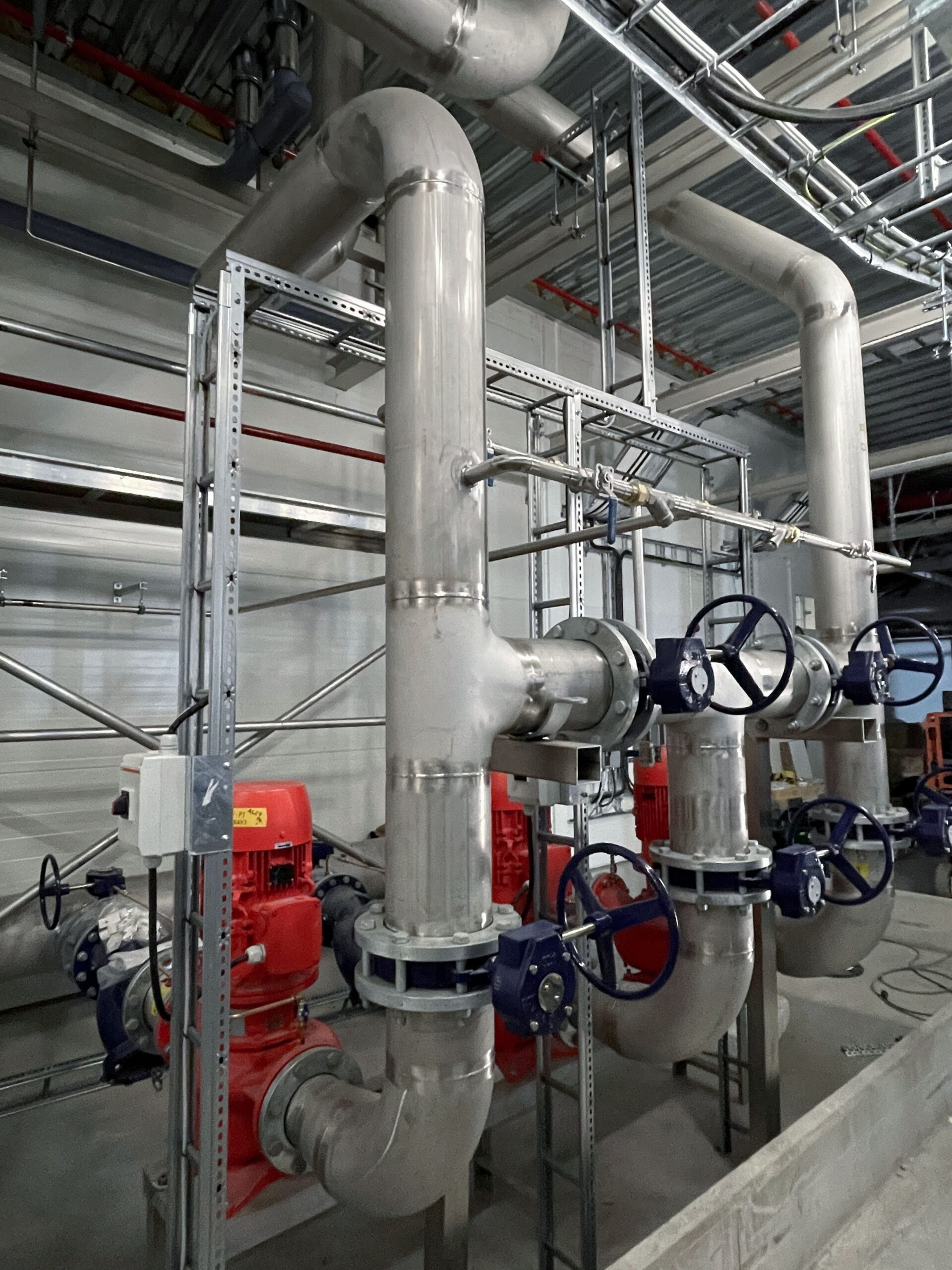 In 2021, we completed a large-scale piping project at Coop Lager in Eskilstuna. This included over 11 km of stainless steel glycol pipes (DN25–300) and black steel (P235GH) ammonia lines connecting compressors, heat exchangers, pumps, and tanks. We installed 51 cooling and 5 freezing units, with the main line routed along the roof and internal connections made beneath the ceiling. All welding met X-ray and visual inspection standards.