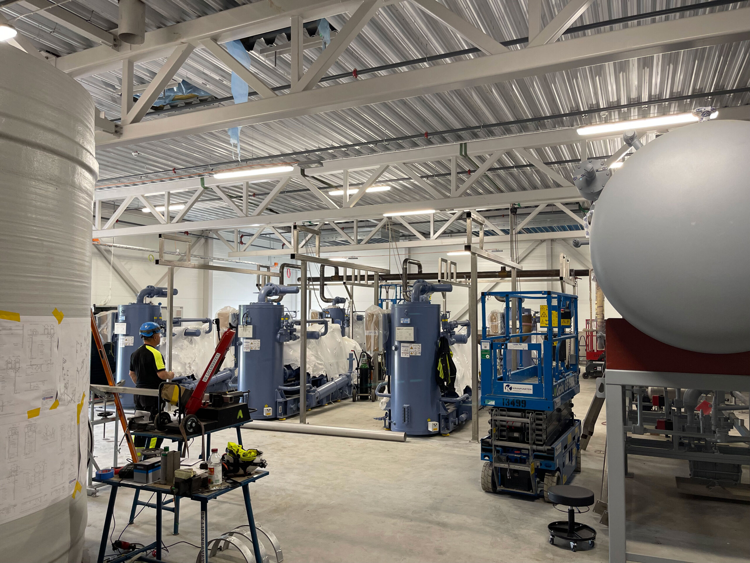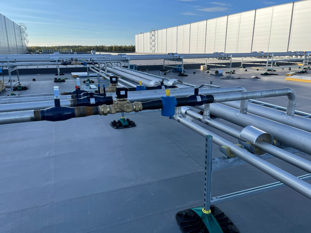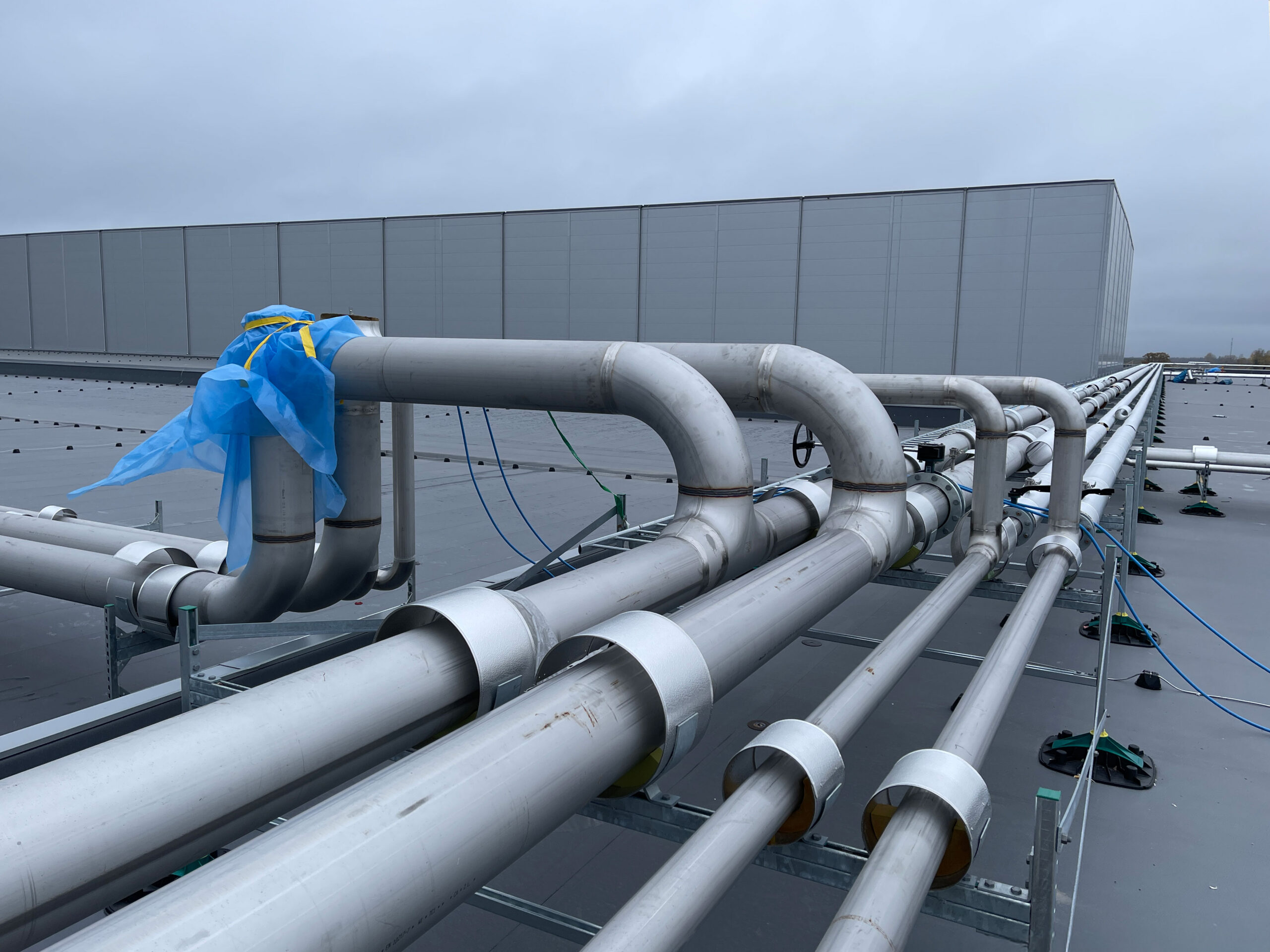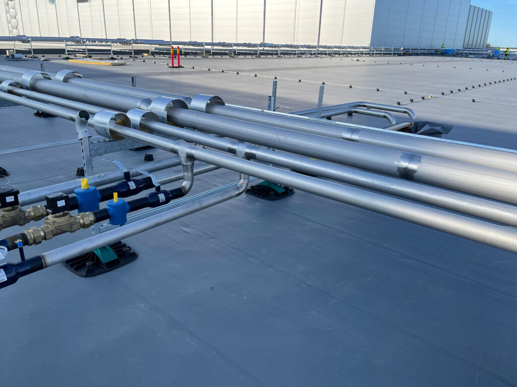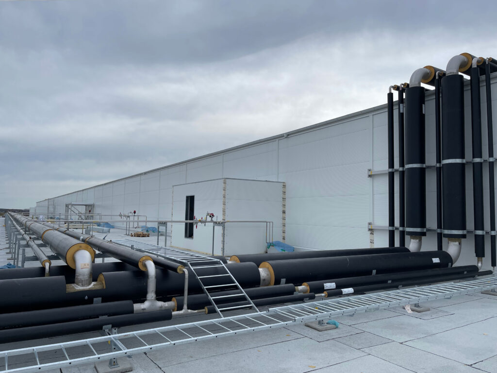 At the IKEA FOOD SUPPLY AG facility in Hyllinge, we completed the full piping installation and welding for two roof levels and the control room. The project included insulated rooftop pipes for glycol and ammonia systems, connections to heat exchangers, tanks, compressors, and valve groups, plus over 12 km of stainless (Ø25–300 mm) and black steel piping. Welding was performed to technical specs, with 10% of welds per welder X-ray inspected. All work met strict safety, quality, and deadline requirements.